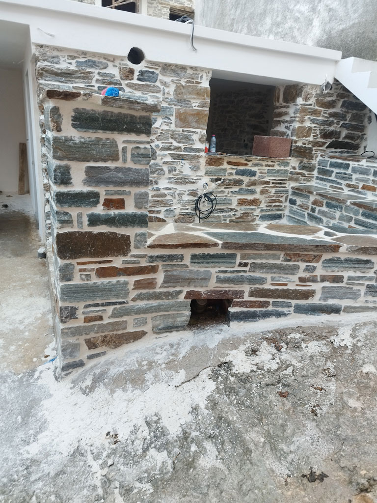 Πέτρινη σκεπή, επένδυση πλακιδίων, διαμόρφωση αυλής & αρμολόγιση σε μεζονέτα.
