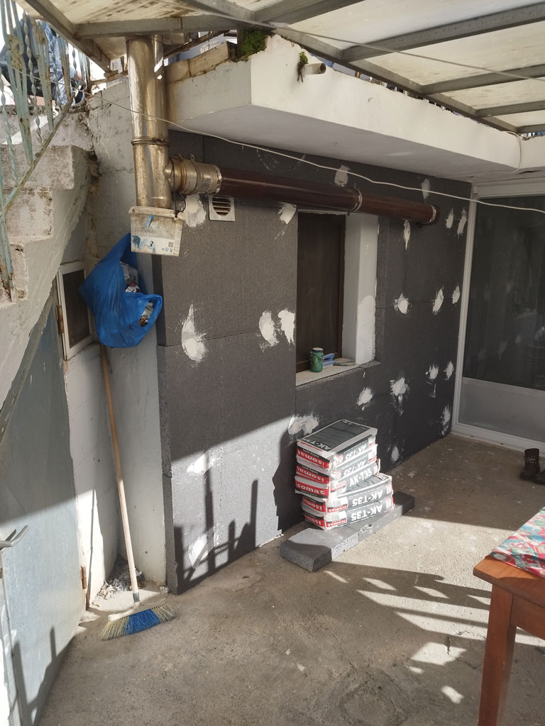 Τοποθέτηση Θερμομόνωσης: Χρησιμοποιήθηκαν πλακέτες EPS υψηλής πυκνότητας, με βάση τον ακριβή θερμοτεχνικό σχεδιασμό. Η τοποθέτηση έγινε με αρμολόγηση και διπλή στερέωση (κόλλα & μηχανικές πείροι), δημιουργώντας ένα συνεχές και αδιάβροχο θερμομονωτικό κέλυφος γύρω από ολόκληρο το σπίτι.